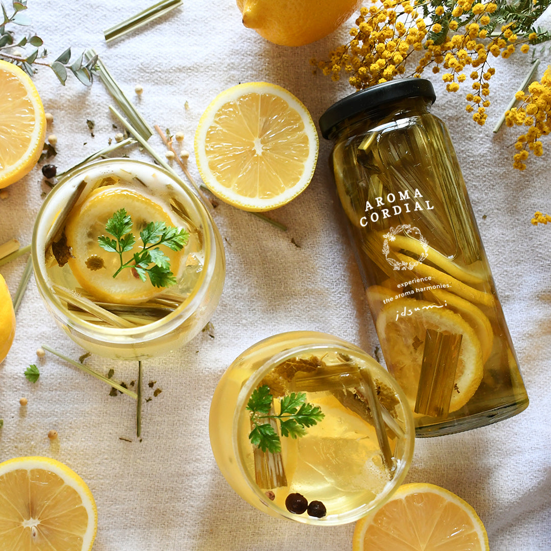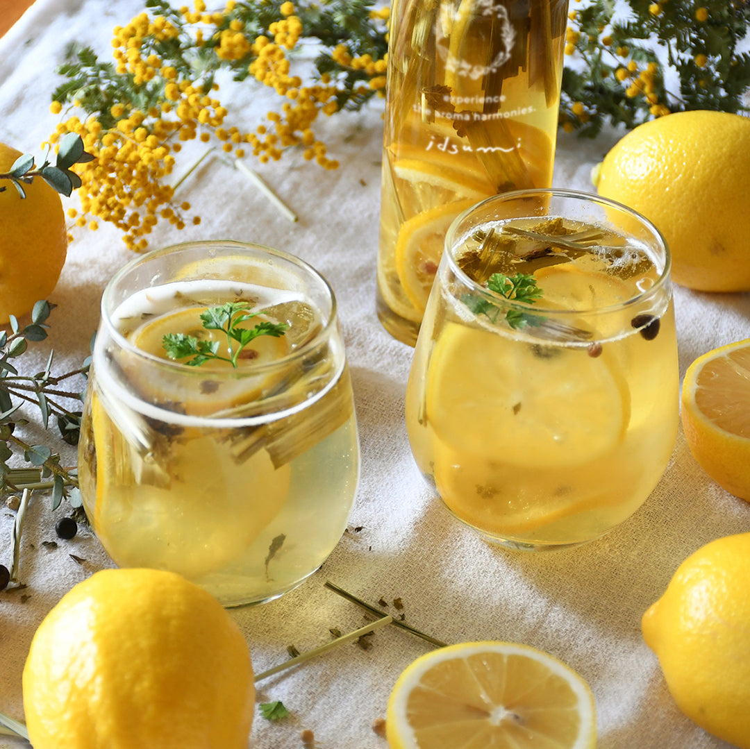 グラスに中の柑橘やスパイスやハーブを一緒にいれてお楽しみください。