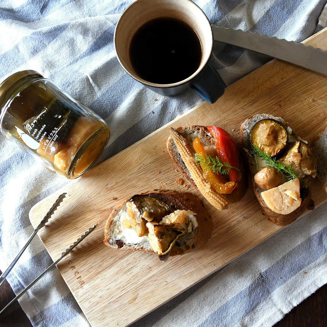 EXバージンオリーブオイルと玉ねぎで旨味たっぷりに仕上げたマリネ風のピクルスです。 ジャガイモやナス、ズッキーニなどをわざと大きくカットして《噛んで食べる》ことにもこだわりました!カットしたバケットを軽くトーストし、クリームチーズを塗った上にマリネをのせると、簡単で極上なおつまみが出来上がり!