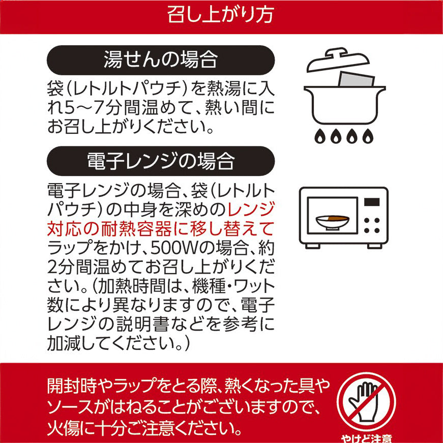 袋(レトルトパウチ)を熱湯に入れ5〜7分間温めて、熱い間にお召し上がりください。